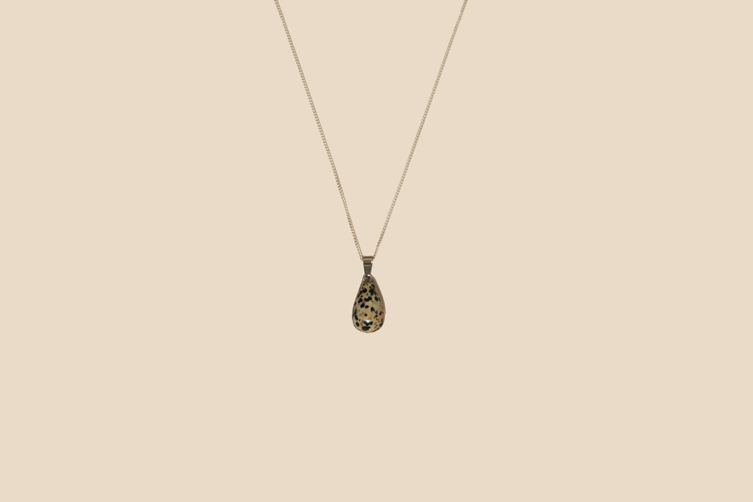 Halsketting Dalmatiër Jaspis beschermt je en zorgt dat je beter kunt aarden. De halsketting is 45 cm lang en de hanger met zilver haakje is gemaakt van Dalmatiër Jaspis.