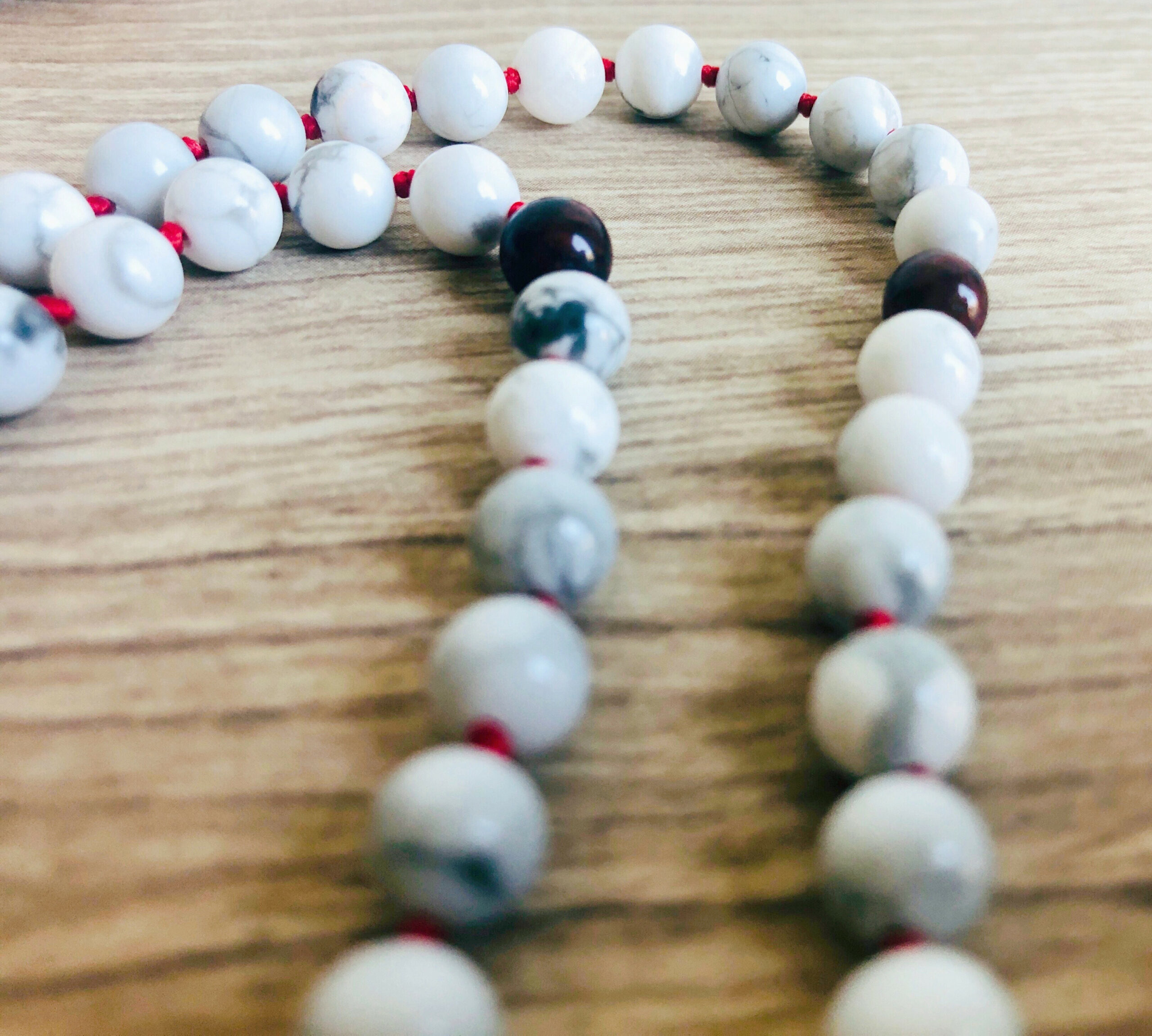 Materiaal: Howliet en Rode Jaspis (108 kralen + 3 extra kralen)